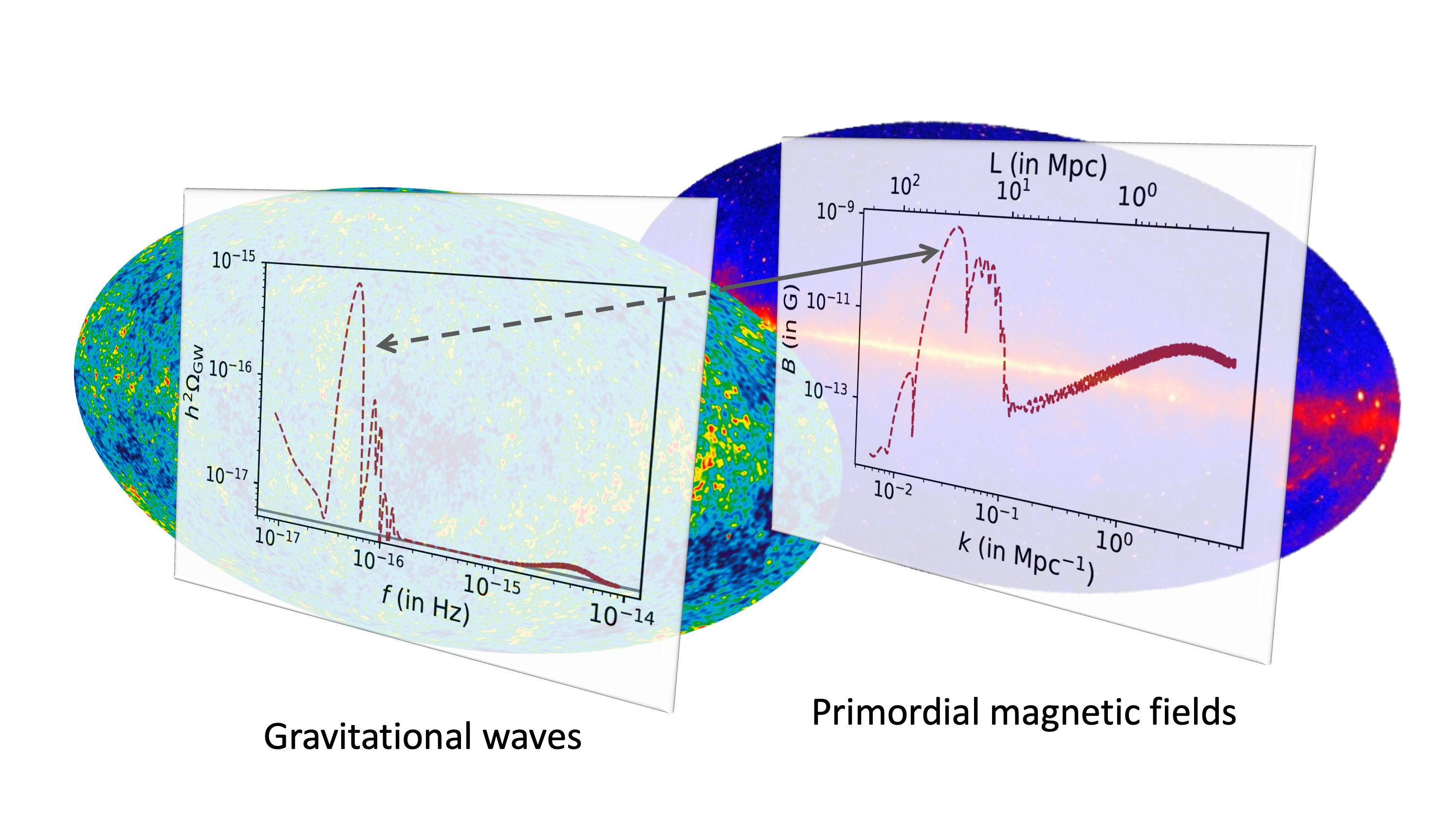 Oksana’s research focuses on gauge fields, such as electromagnetism, and their interactions with other fundamental particles active in the early Universe. These interactions can leave behind subtle “fingerprints,” encoded in gravitational waves and cosmic magnetic fields. An illustration of such signals is shown below.