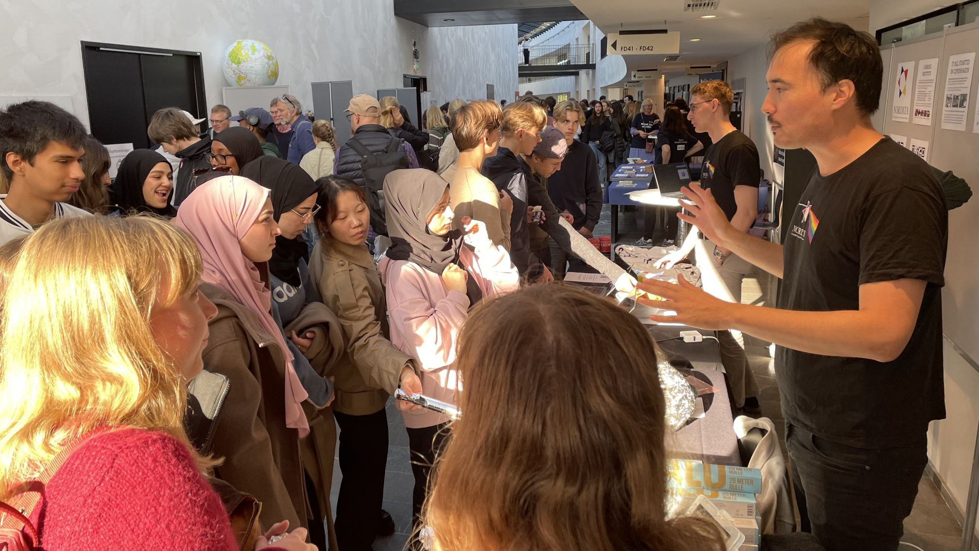 Today, Nordita participated in ForskarFredag, organized by Vetenskapens Hus (KTH/Stockholm University), and it was a fantastic experience! The event brought together students, teachers, and researchers to explore science and our stand was buzzing almost nonstop. Students gathered to try out the engaging, hands-on physics experiments our researchers had prepared: